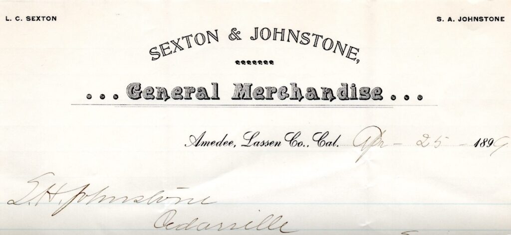 In 1893, the town’s leading merchant, E.C. Brown filed for bankruptcy. L.C. Sexton and Sam Johnstone acquired Brown’s general mercantile store. In 1899, Johnstone bought out Sexton. In 1901, Johnstone and Jacob Hart purchased the Amedee Hotel. In 1903, Hart dissatisfied with Amedee, sold out toJohnstone.