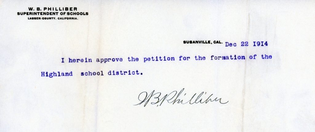 The school district was approved on January 5, 1915. Its existence was brief, and in 1925 the Highland School was annexed to Ravendale. The following year, the school’s fixtures were transferred to the Madeline School only to be destroyed by a fire in 1927.