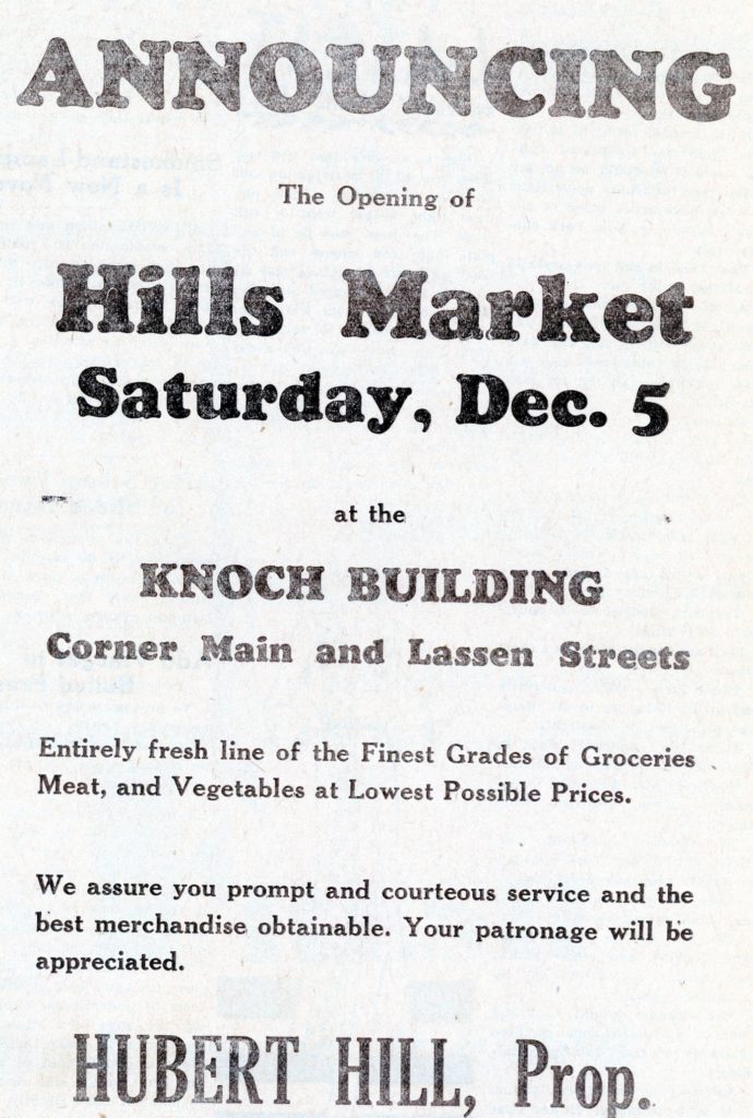 It was on this date in 1931, Hubert “Hoolie” Hill opened Hill’s Market in the Knoch Building on the corner of Main and Lassen Streets. Hill was formerly associated with the Mt. Lassen Packing Company. The market was also known as the Red & White. In 1939, Hill opened a second store on Highway 36, next to the Meadows and across from the Coppervale Ski area. He sold that store in 1941, and it became known as the Meadows Market.