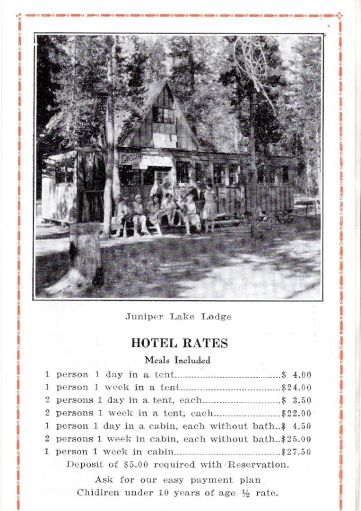 The Snells who owned Juniper Lake Resort east of Drakesbad, was primitive by Drakesbad’s standards. Nonetheless, one could rent a tent there for one night in the 1930s for four dollars. For a couple it was seven dollars. While that might not sound a lot today, the average prevailing wage just happened to be four dollars a day!