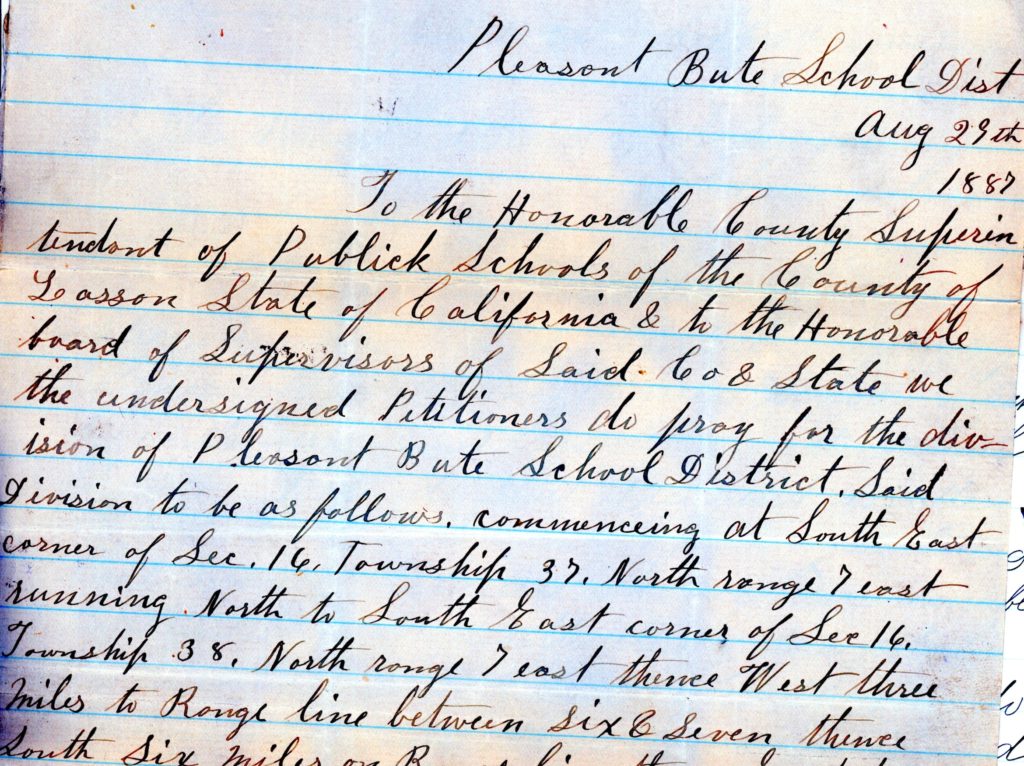 On August 23, 1887, residents on the west side of the Pleasant Butte School requested that a new district be established on the grounds: “The School House being so situated now that the greater portion of the Schollars in the Division we mention cannot attend the greater portion of the time on account of the Sloughs being full of water.” On September 27, 1887, Myra Parks, Lassen County Superintendent of Schools, informed the Lassen County Board of Supervisors that she personally inspected the conditions and recommended the Pioneer District be formed, that creating a new district would not be detrimental to Pleasant Butte. In October 1887, the request was granted.