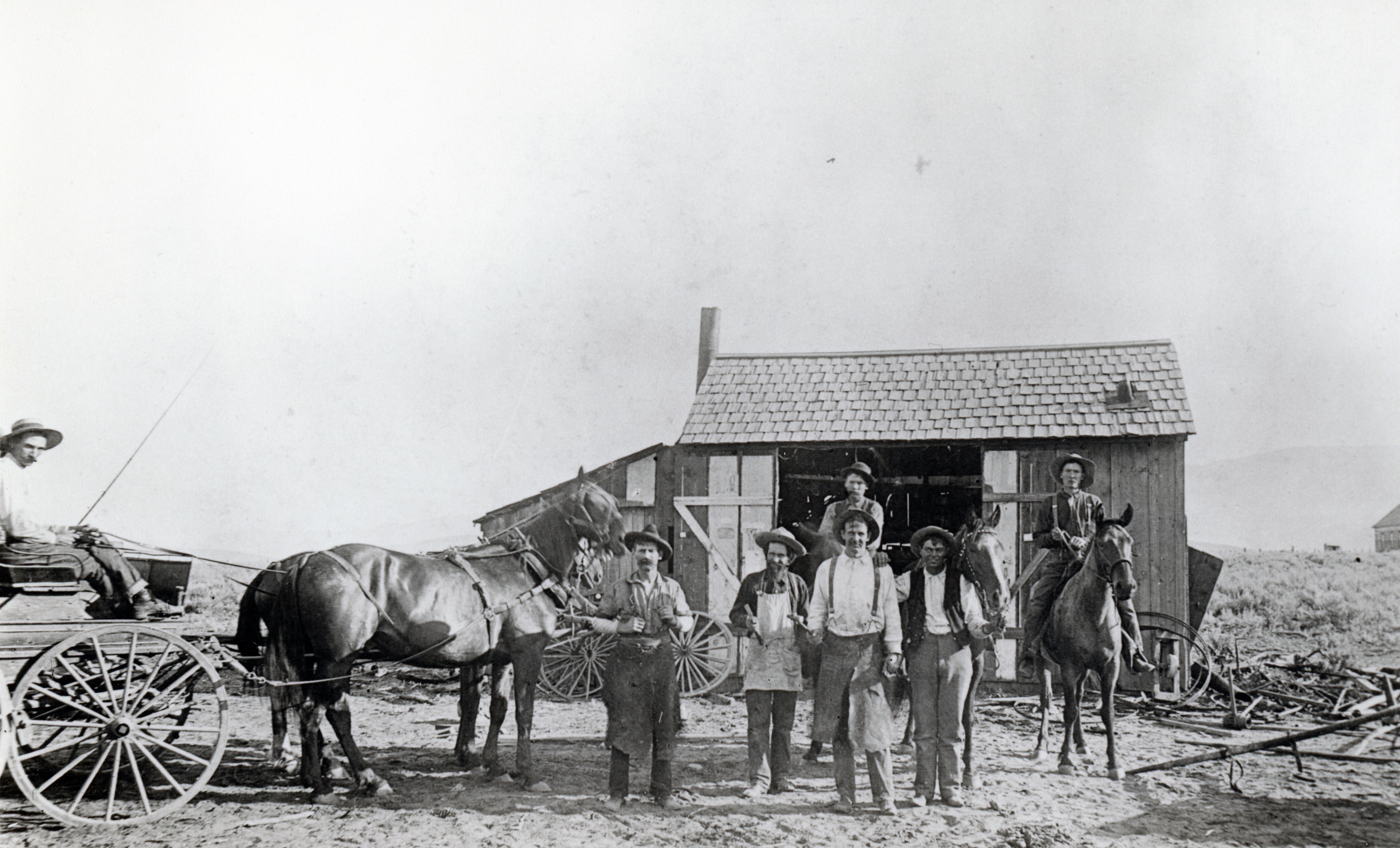 Johnstonville Blacksmith Shop, circa 1900. On the wagon, George Wright. Standing (Left to Right) Aaron “Dad” Hooks, owner of the blacksmith shop, Frank Elledge, Booth Elledge, and the others not identified.