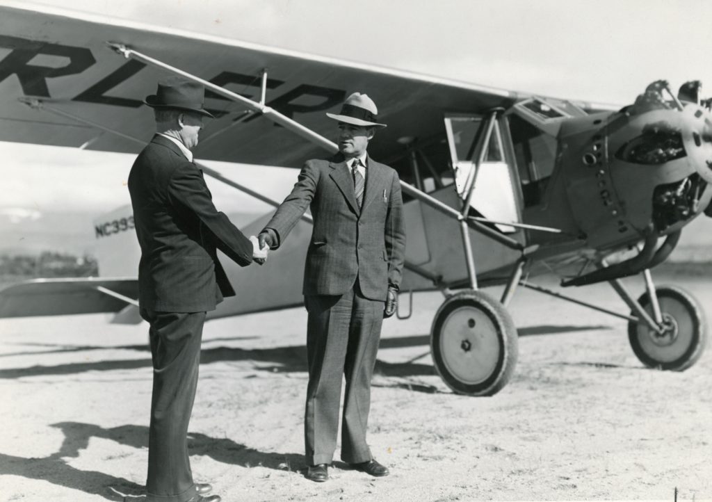 Postmaster Elmer Winchell with Ben Curler at the inagural airmail flight at the Susanville airport on May 19, 1938.
