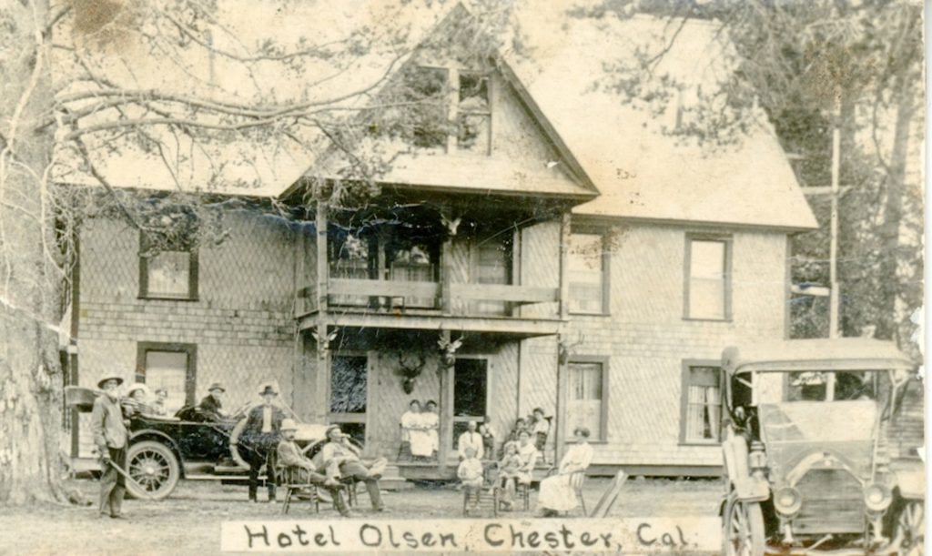 In the early 1900s, the Great Western Power Company began acquisition of the ranches in Big Meadows, with their intention to create a reservoir, a part of their hydroelectric power system. The Olsen family sold nearly a 1,000 acres of the ranch, retaining a small acreage surrounding the ranch house. In the fall of 1911, Olsens, along with their neighbor, Edith Martin subdivided their respective properties to create the town of Chester. Olsen’s Southern Addition consisted of twelve blocks containing 115 lots. In 1914, the Olsen’s built a major addition to their ranch house and now became the proprietors of the Hotel Olsen, a first for that community. Nels and Eula Olsen operated it for many years and on April 4, 1948 they sold the hotel and the remaining Olsen Ranch to Earl McKenzie and the hotel was subsequently closed.