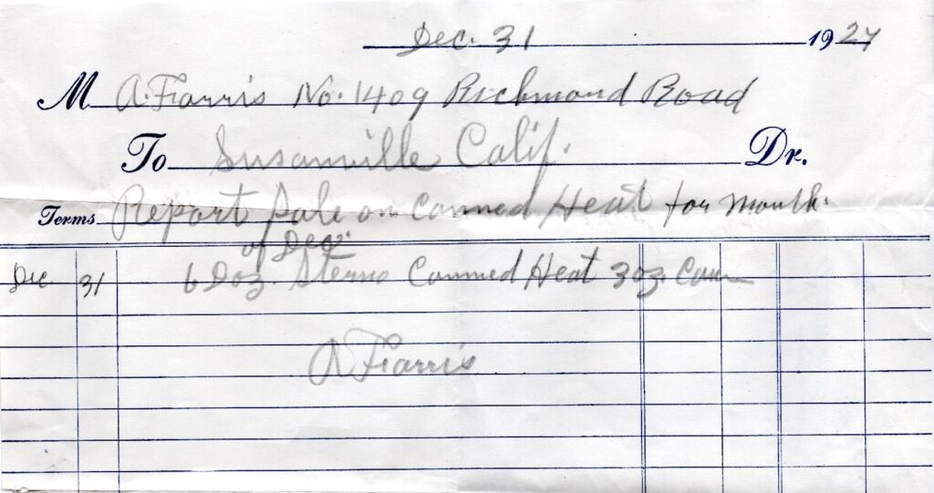 Then came along Prohibition. One of the ingredients of canned heat is methyl alcohol, than can be deadly if ingested. This did not stop individuals straining canned heat with a cheesecloth to extract the alcohol. It was not only a nation wide crisis, but a local one as well. In March 1926 the deaths of John Murphy and Pete Nelson were attributed to the consumption of canned heat. It took local officials over a year to curb the usage of this product. In the fall of 1927 both the City of Susanville and the County of Lassen passed ordinances requiring that dealers of canned heat obtain a special license to sell it. The license cost dealers $50 per quarter. It was presumed that by making the special license so high, it would eliminate the product from the shelves. It worked and canned heat was no long a problem locally.