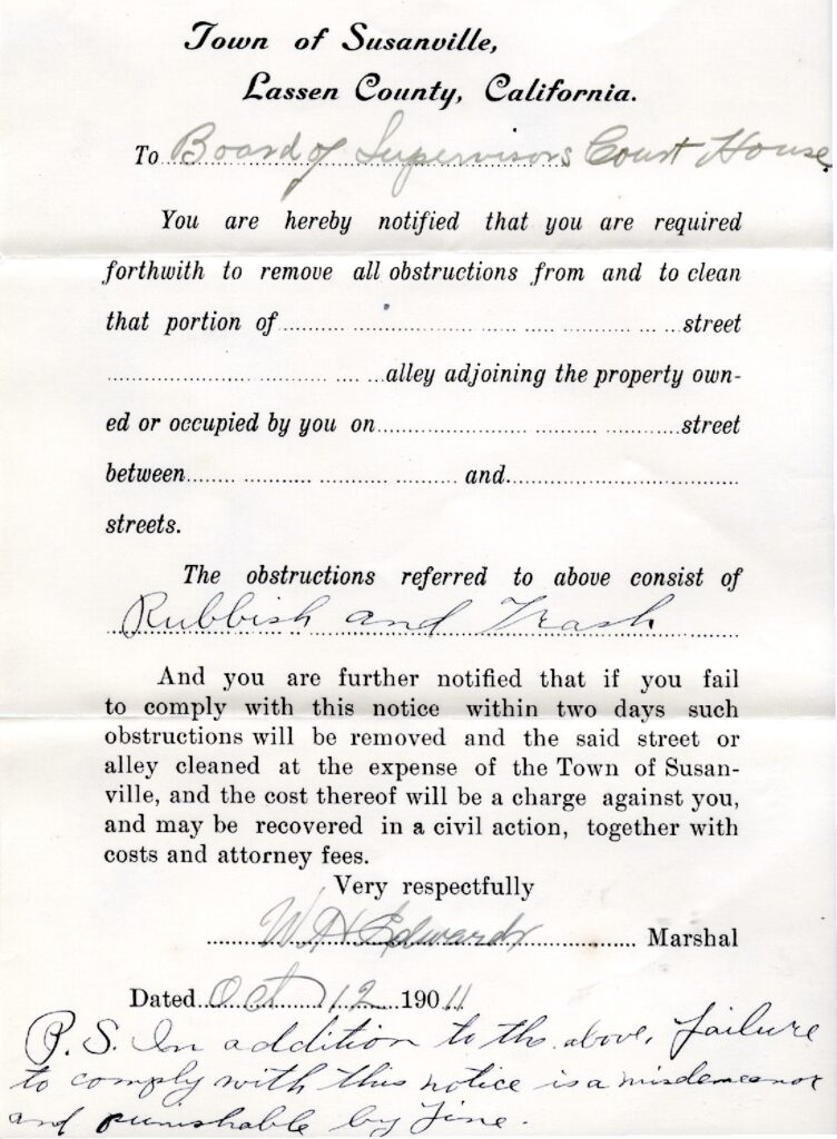 Typical of the era, map makers were one dimensional. Susanville’s original plat, shows Union Street extending beyond Cottage and connecting Weatherlow Street at the Richmond Road bridge. There were two problems. First the proposed street would dissect the block that was home to the Susanville School District. The other was the physical restraint of the hillside for Union to connect with Weatherlow. During the messy title problems of the 1870s, caused by the town’s founder, to rectify this particular situation, that segment of Union to Weatherlow was abandoned.