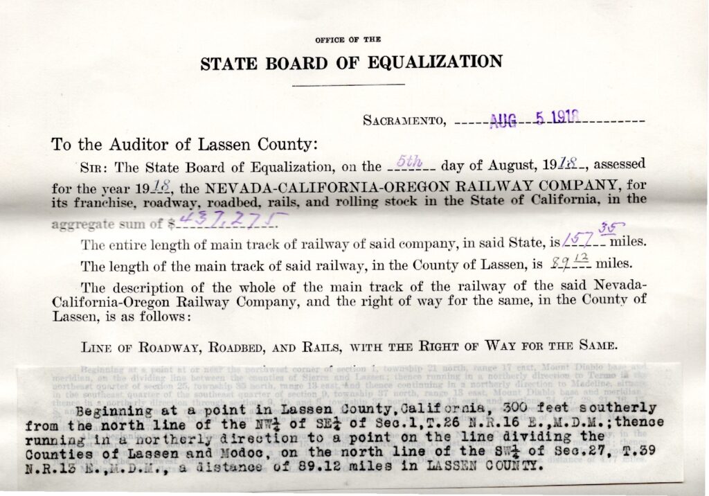 The State Board Equalization is a wealthy repository for information. When it came to taxing railroads, the Board compiled information about each railroad, and was broken down by trackage and the shared assessed value. The taxes collected would be distributed to counties to fund roads and schools. Here is some information of the 1918 reports for the NCO and Western Pacific.