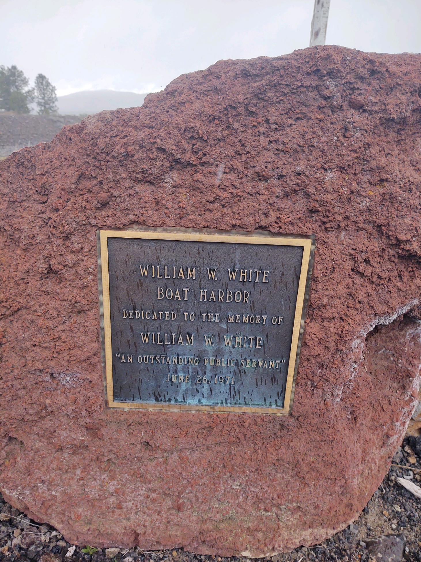 Far from a household name to Lassenites, William W. White (1919-1970) has an interesting legacy in the annals of Lassen County history. A native of Montana, he came to Susanville in 1953. In 1959, he was hired as Lassen County Planning Director. He saw the potential at Eagle Lake and was committed to the development of the marina and campgrounds. He resigned his position as planning director effective June 30, 1967 to take a new position as the Planning Director for Tehama County. He died suddenly on September 20, 1970 at the age of 51. At the December 28, 1970 meeting of the Lassen County Board of Supervisors, they passed Resolution 1961 to name harbor at Eagle Lake after White. On June 26, 1971 a plaque dedication at the harbor was held.