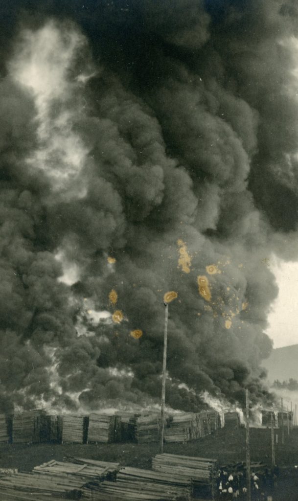 On September 17, 1917 at approximately three in the morning, a fire of unknown origin erupted in the middle of the south lumberyard. It was not until noon, with 2,000 men battling the fire, that it was contained. Fortunately, it was one of those typical fall days with no wind otherwise the entire plant would have been in jeopardy. The final result was that 60 million board feet of lumber was destroyed. If there was one bright spot, it was that the lumber that was destroyed was deemed of such low grade as to be only suitable for the box factory. However, it was still a considerable loss to Red River, as the value set at two million dollars. Insurance adjusters, however, placed the loss at $800,000. It was determined the fire was of suspicious origin, no doubt started by an arsonist. While an investigation did not provide any real clues as to the individuals responsible, phosphorous bombs were found on the property.
